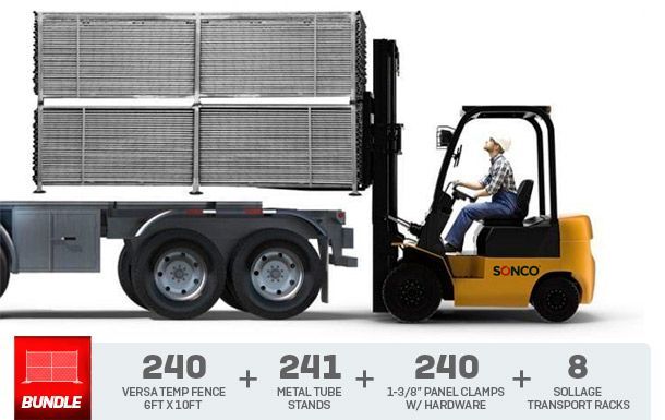 This truckload is priced per kit, with a minimum order of 240 kits. Each kit includes one fence panel, one metal tube stand, and one clamp. When ordering the full truckload, you also receive 8 Sollage transport racks to keep panels organized.