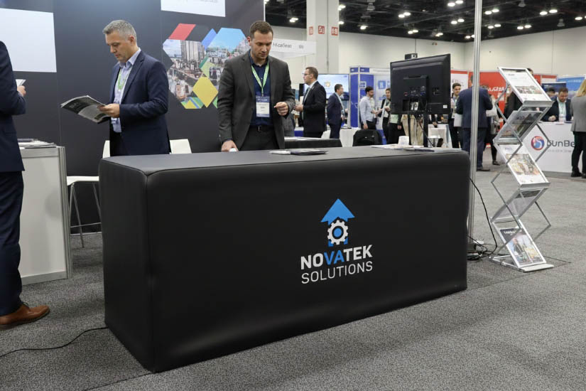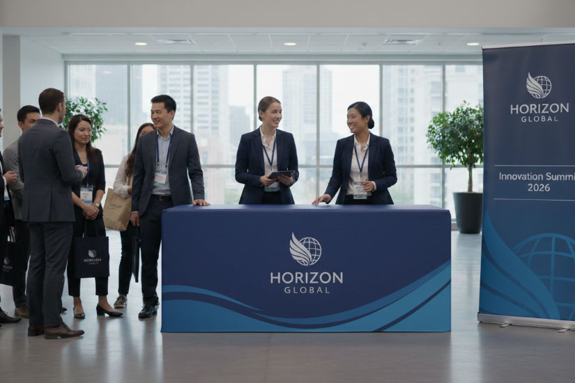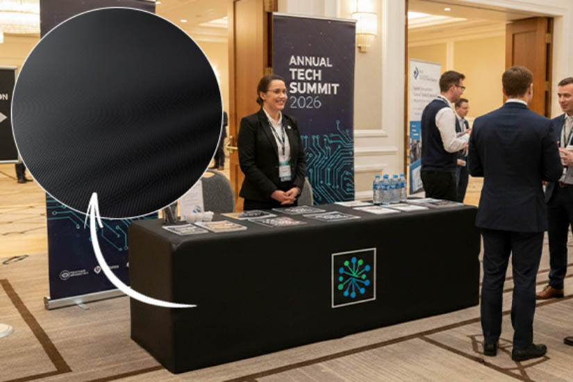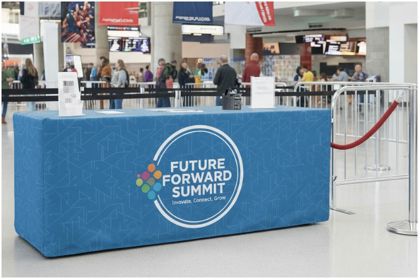 Made as a single-piece slipcover with shaped corners, this custom fitted table cover follows the table’s dimensions closely for a clean, structured appearance at registration desks, sponsor tables, and exhibitor booths.