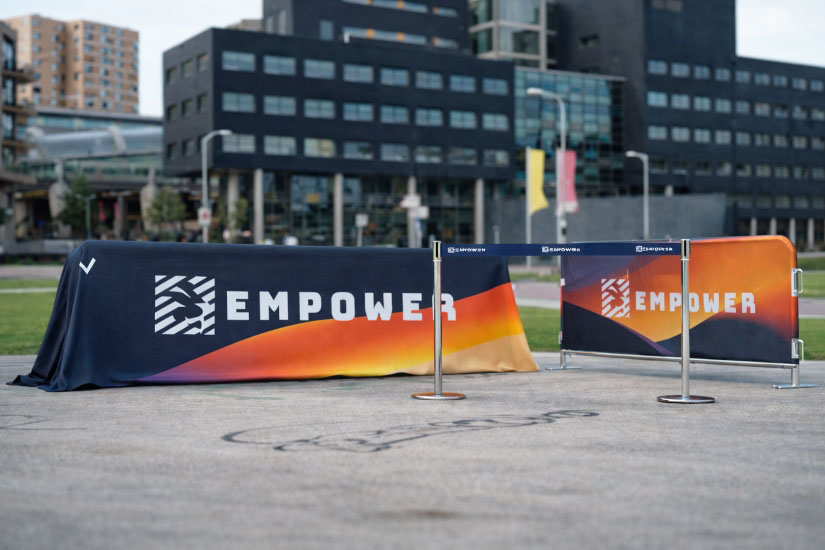 Add crowd control products like barricades and stanchions to support your event layout. Pair your custom table cover with coordinated hardware to create a consistent and professional presentation. Browse our crowd control selection to find options that complement your printed table cover and help organize your event space.