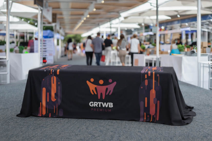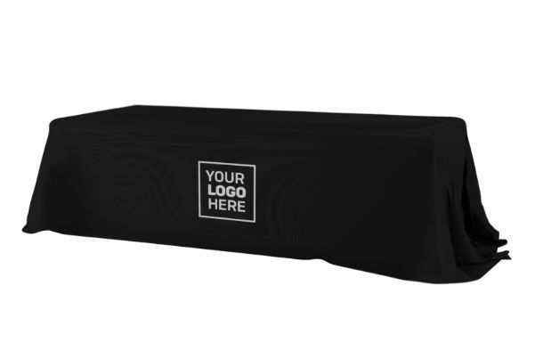 - Full-color custom printed table cover with logo featuring edge-to-edge branding.