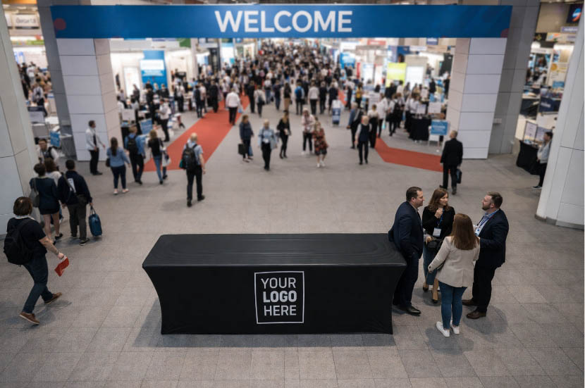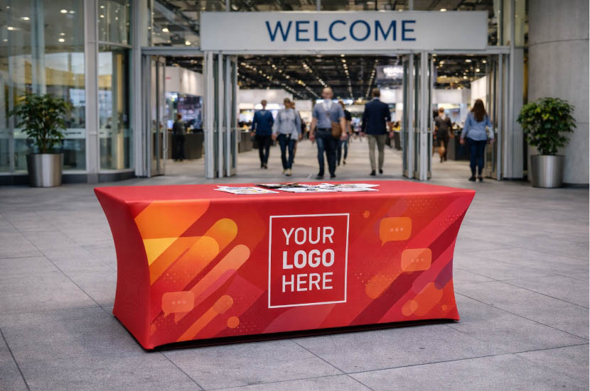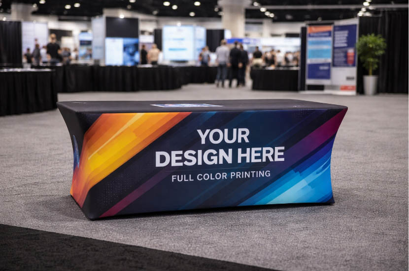 This custom stretch tablecloth uses stretch fabric to wrap tightly around the tabletop and legs, creating a uniform surface. This tensioned fit helps keep the cover in place during busy events, making it a practical option for exhibitor booths, demo stations, and registration areas.