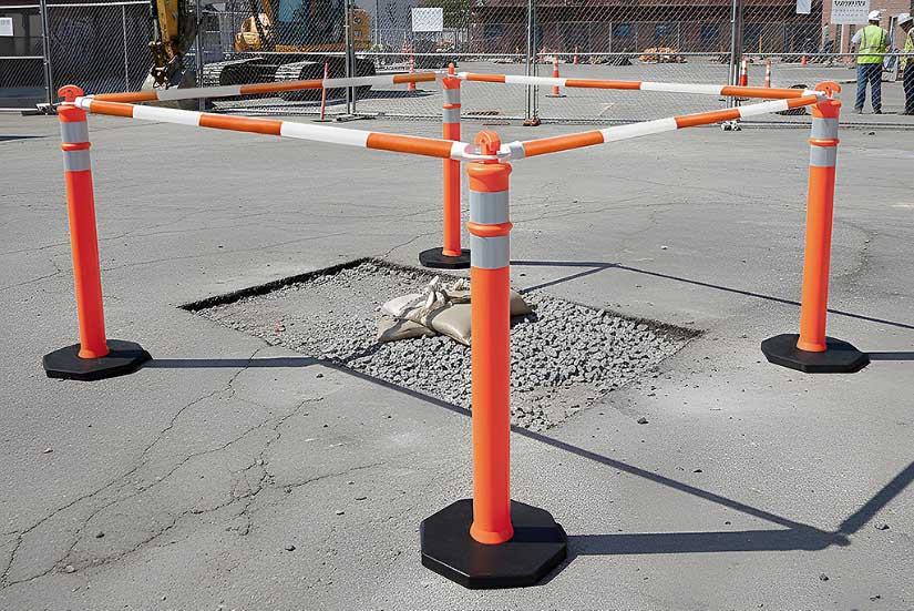 Adjustable from 6’ to 10’ in length, lightweight, portable, and designed with orange-and-white stripes for visibility. |