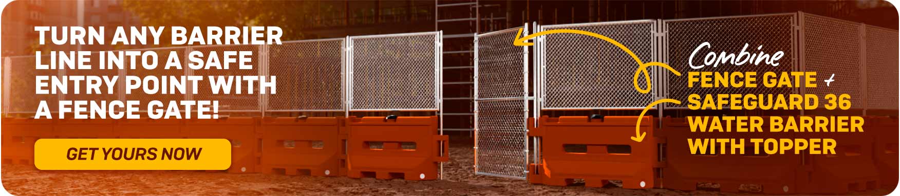 A: SONCO gates are designed to work with standard chain-link fence panels and can also be used with water barricades with fence toppers. For guidance on compatibility and installation, contact one of our fence experts.