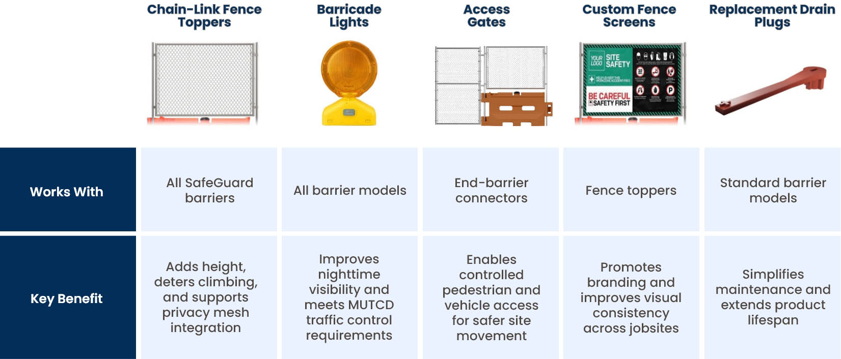 SONCO accessories help create safe, visible, and branded setups for any site. Each piece works easily with our water-filled barriers to improve protection and site flow.