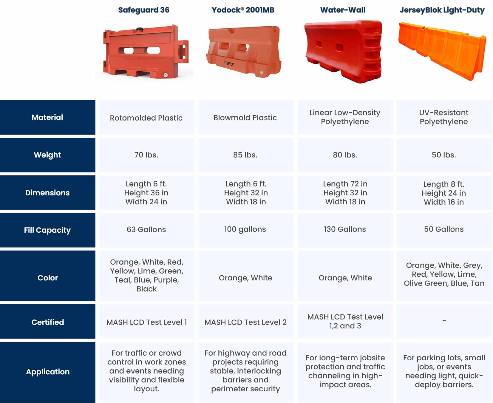 A: Each model serves a unique purpose. Heavier barriers, like Yodock and Safeguard, work best for traffic control and jobsite protection, while lighter designs are used for parking, pedestrian areas, and events.